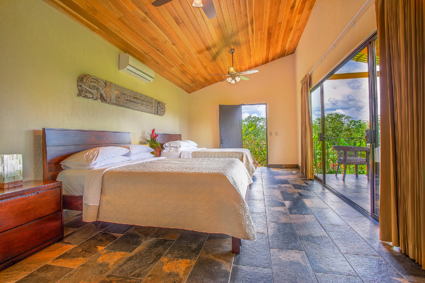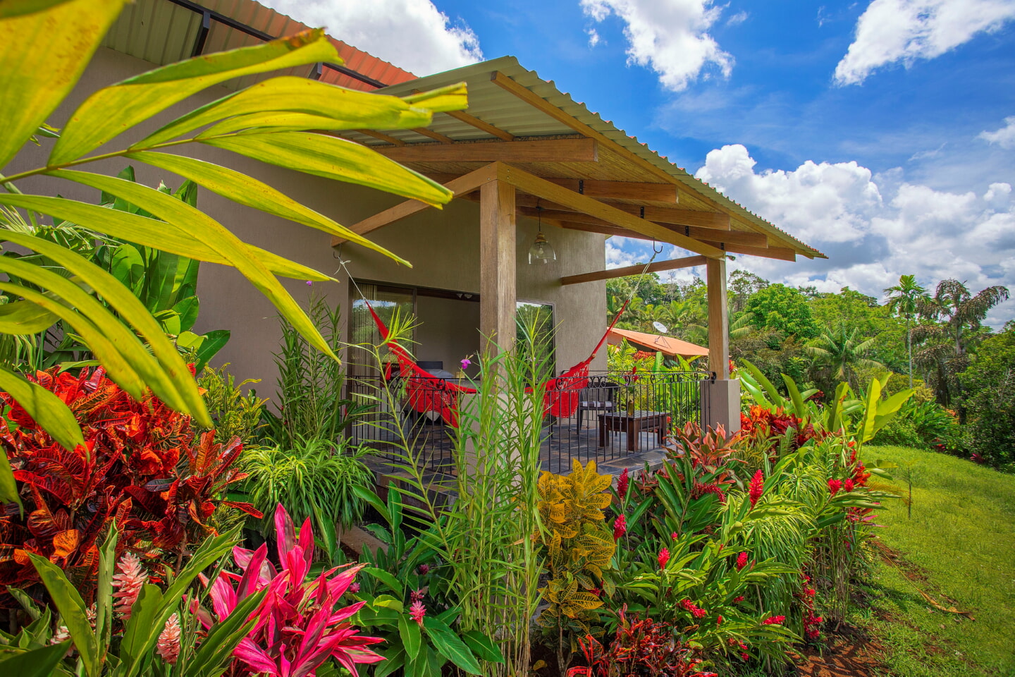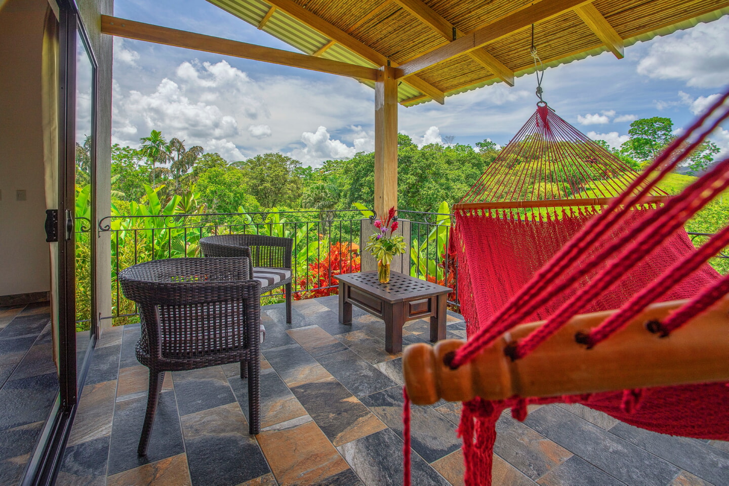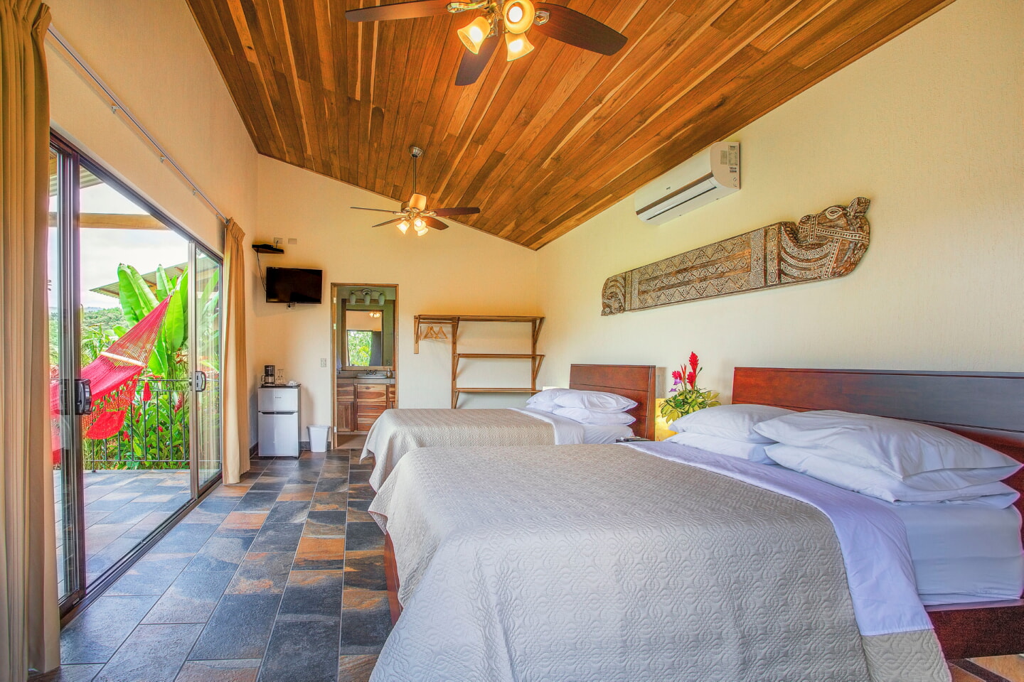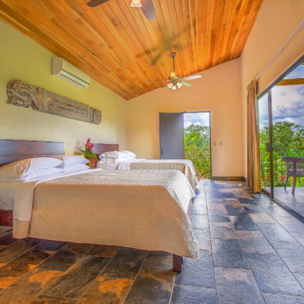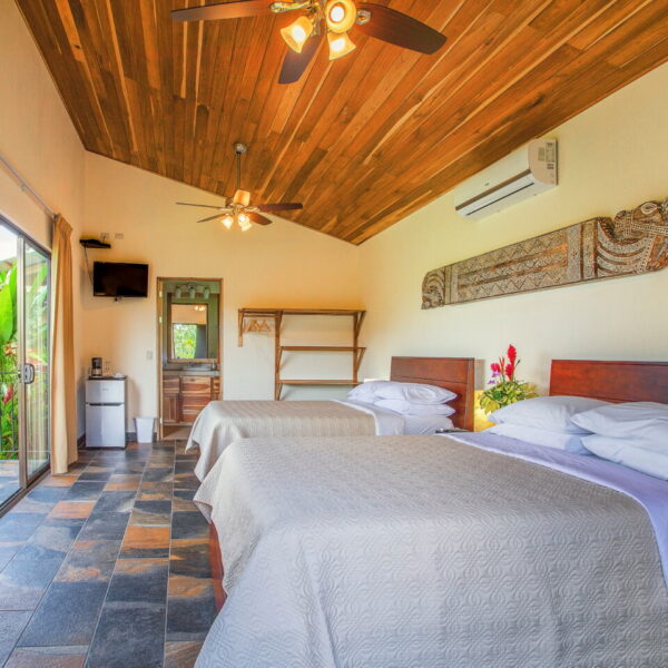 Deluxe Queen Room 4 Guests 2 Queen Beds 1 Bathroom Room Features 2 queen-size bed Spacious bathroom with hot water shower Private terrace with rocking chairs and a hammock Stunning views of horse fields and Platanar Volcano Room Amenities Wifi & Internet Air conditioner Mini-fridge IPTV Safety Box 64-26 Room Phone Bath Amenities Hair Dryer Coffee Maker Book Your Stay Colibrí Iguana y Gecko Book Your Stay
